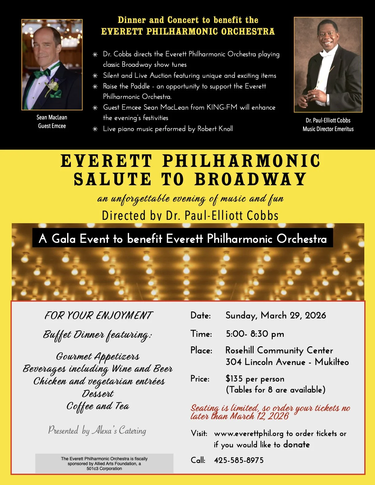 Be sure to check our website frequently for updates as well as our Facebook page, as you’ll find new performances and media from our musicians and team. If it is within your means, our website is also the easiest way to make a donation. Everett Philharmonic Orchestra depends on YOU, our audience, for support. Thank You!